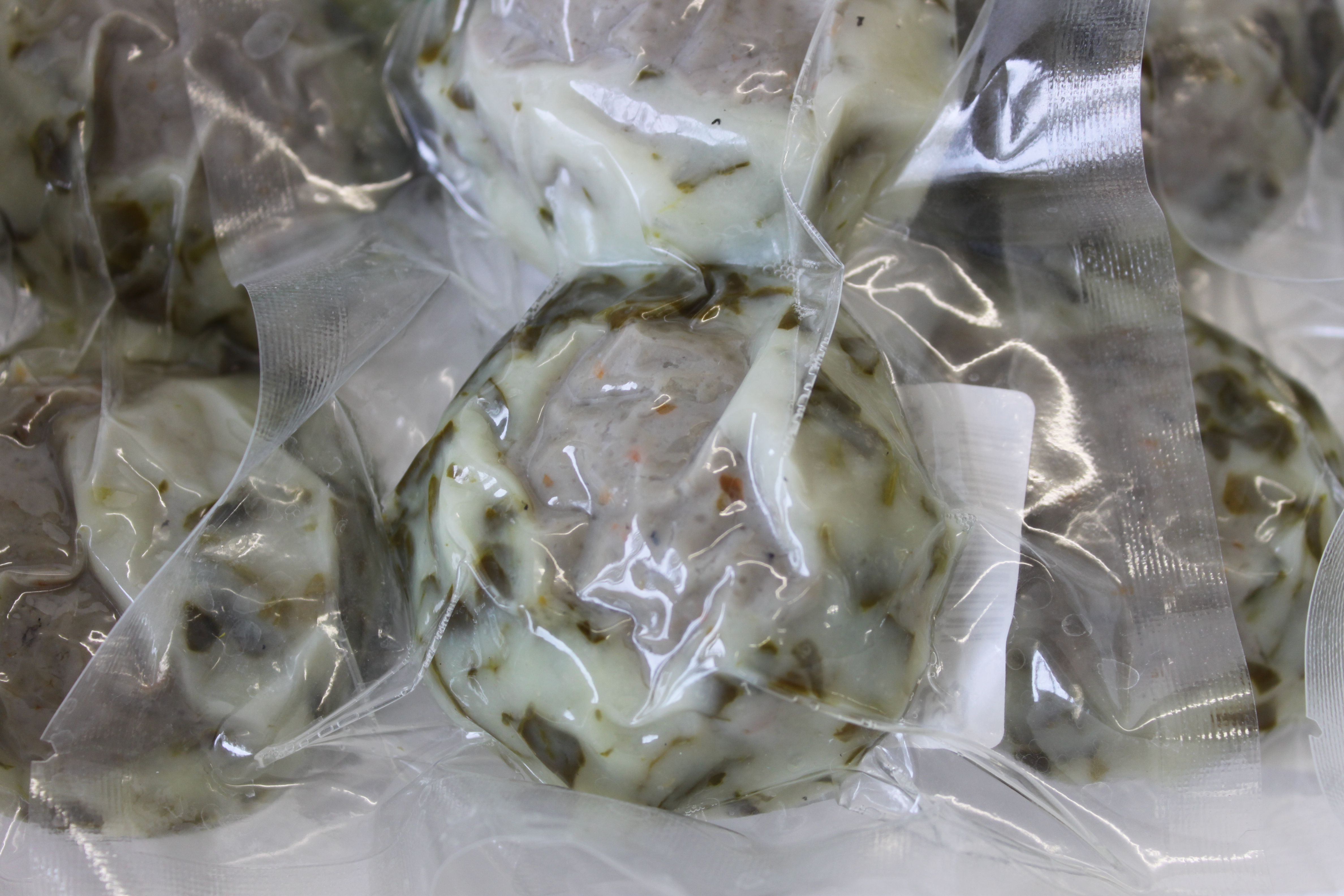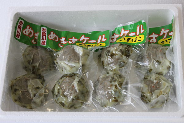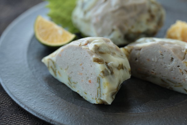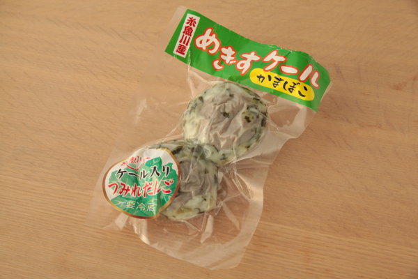 かまぼこ屋さんとのコラボ商品。日本海で捕れたメギスのすり身を中心に置き、周りをタラの白身に細かく刻んだケールの葉を入れたかまぼこで囲みました。見た目の緑色が濃いですが、ケール独特のクセを控えめに押さえているので、野菜嫌いのお子様や苦手な方でもビタミンCやβ-カロテン、マグネシウムやカルシウムなどケールに豊富に含まれる栄養素をおいしくお召し上がりいただけます。口の中でうまみが広がります。