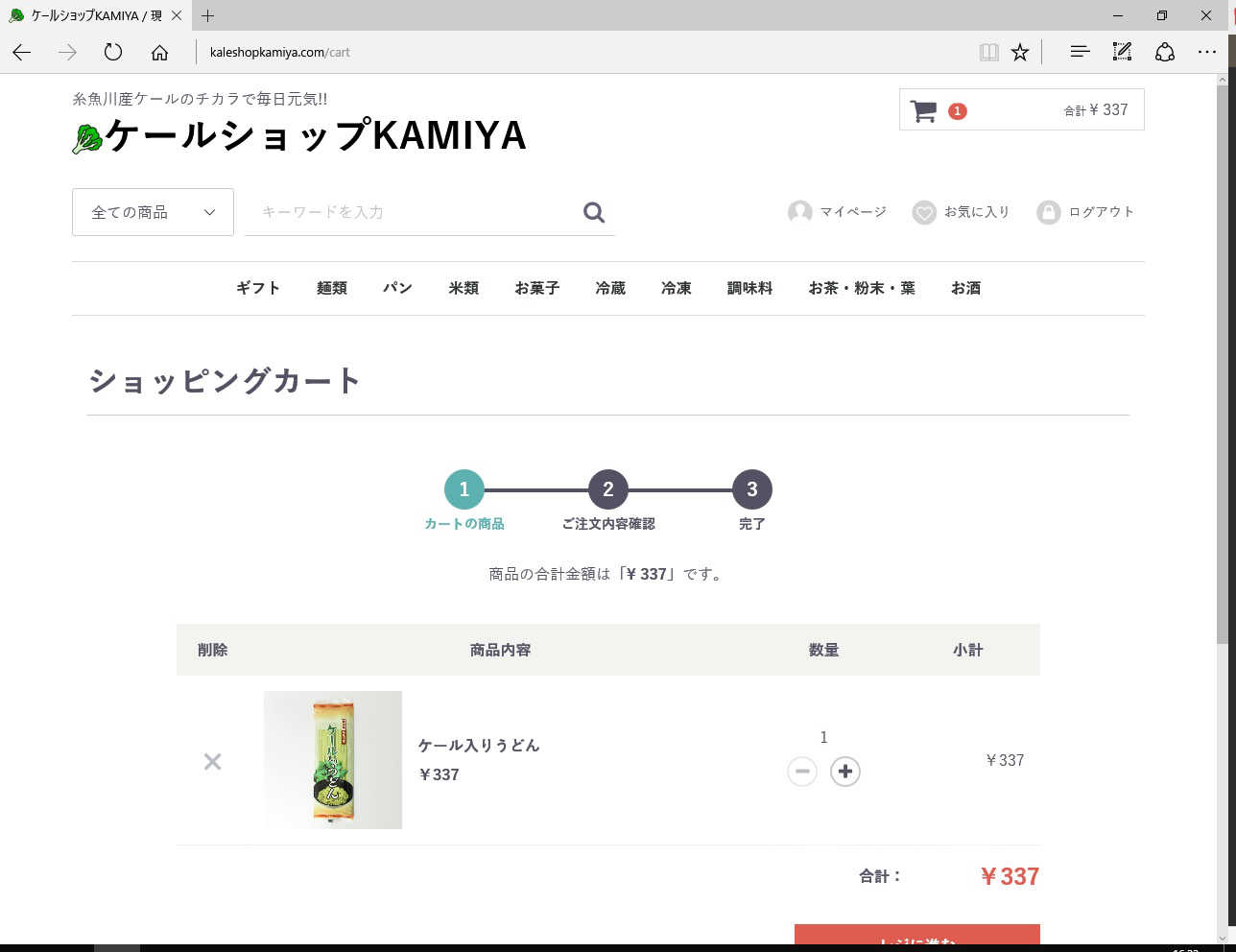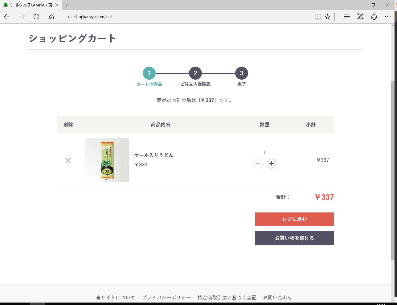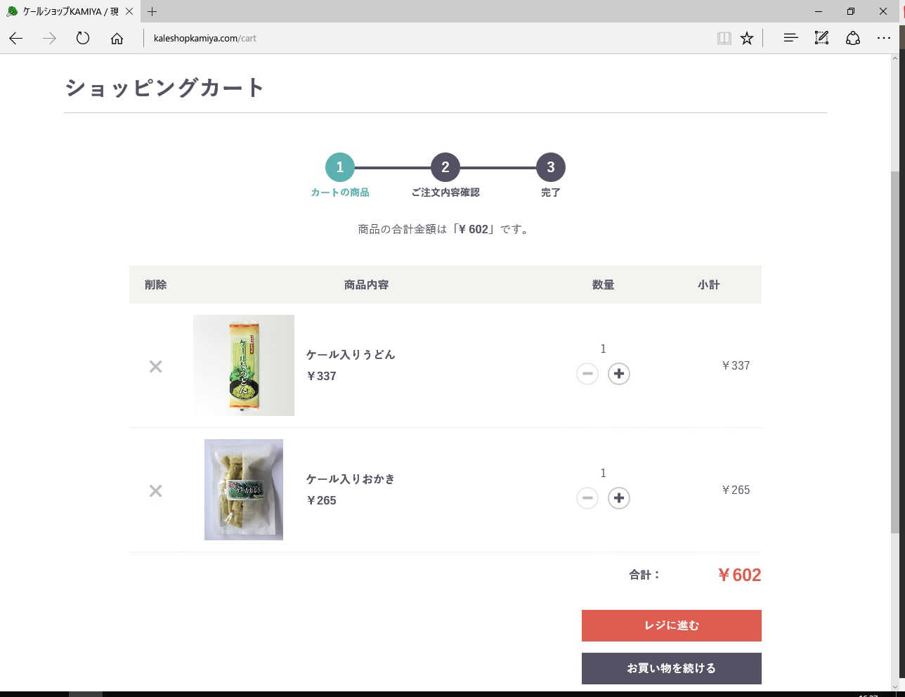 ショッピングカートに入っている商品が一覧表示されます。商品の削除や数量の変更はここで行います。他の商品もお求めのときは「お買い物を続ける」を、お買い上げのときは「レジに進む」をします。